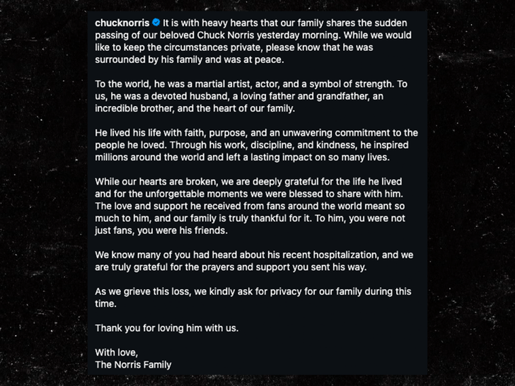 Norris murió el jueves 19 de marzo de 2026 por la mañana en Hawái, según informó su familia, que declaró: «Con profunda tristeza, nuestra familia comunica el repentino fallecimiento de nuestro querido Chuck Norris ayer [jueves] por la mañana. Aunque preferimos mantener las circunstancias en privado, les informamos que estaba rodeado de su familia y que descansaba en paz».